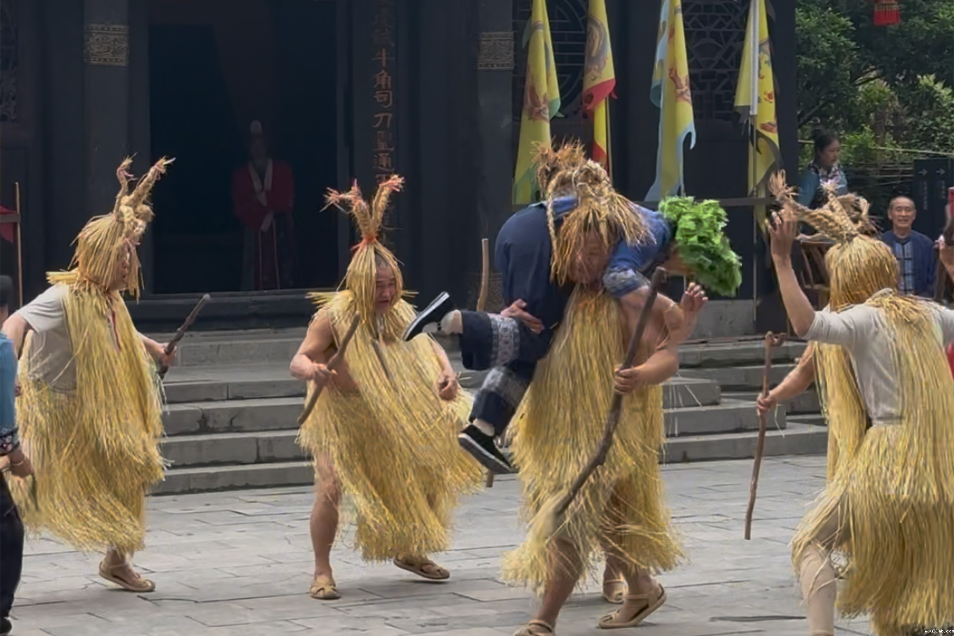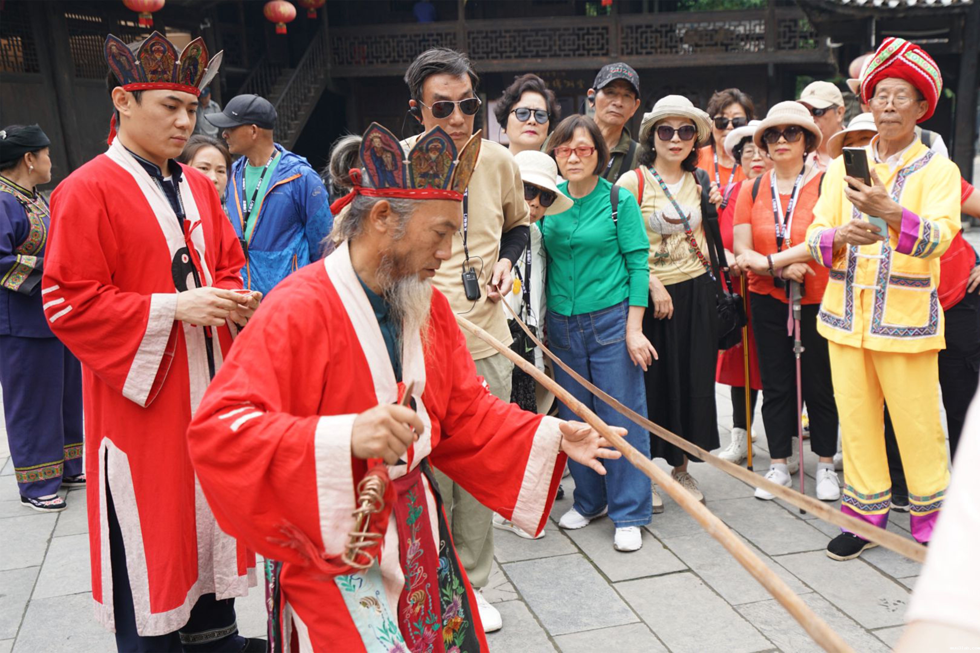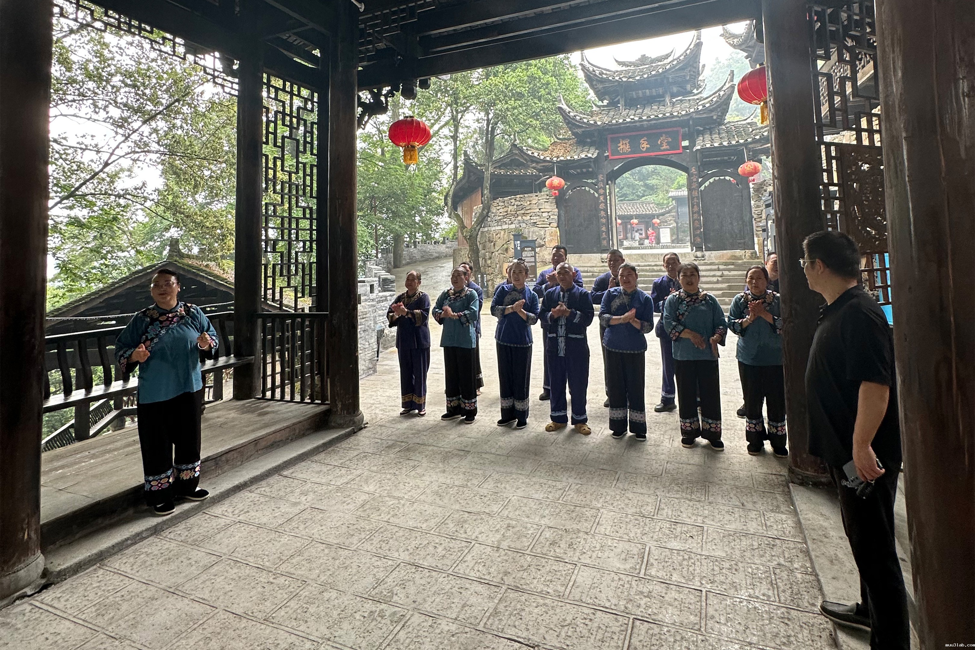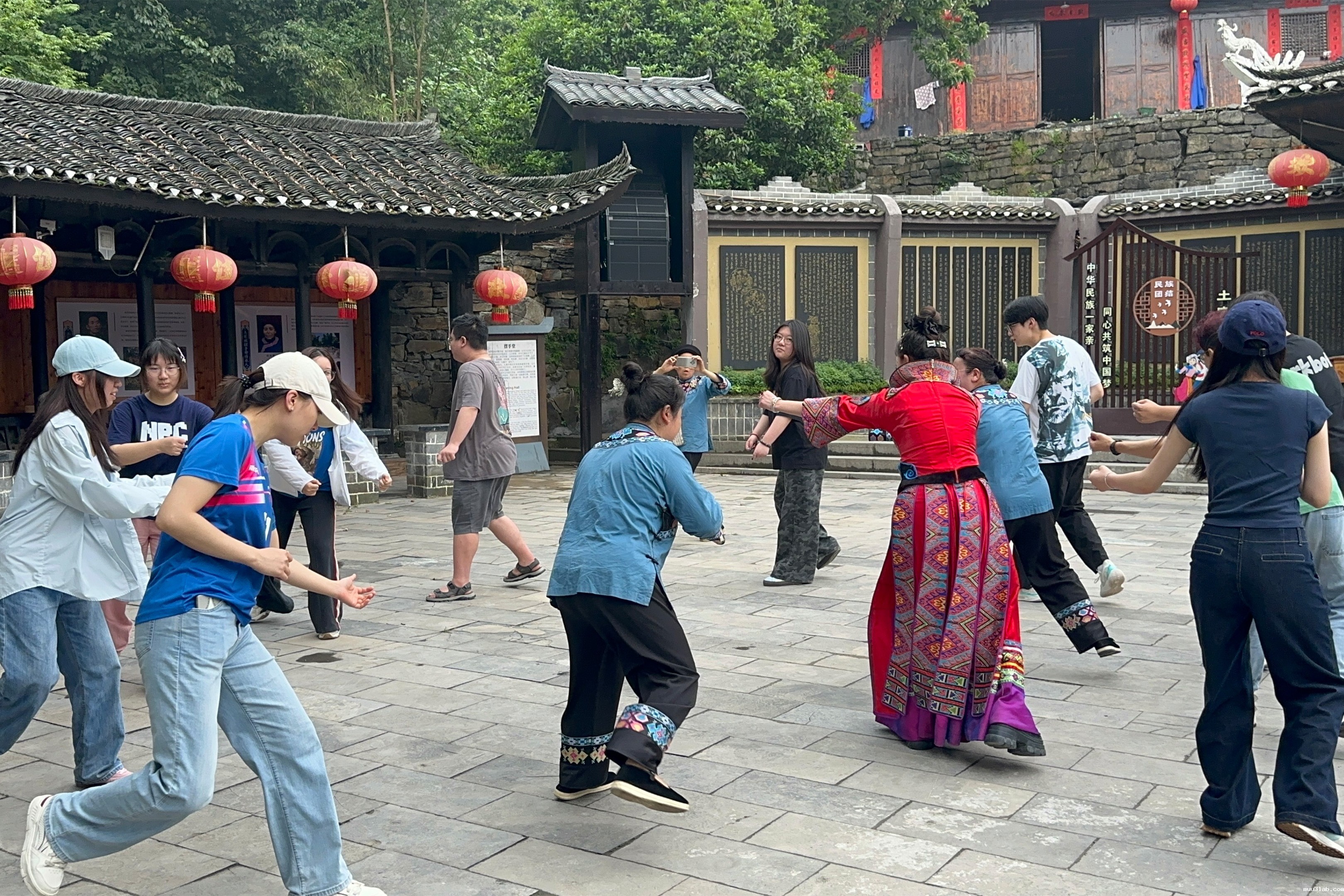 双凤村在千百年来遗存着土家族的民族语言、音乐、建筑等珍贵史料,因此被民俗学家誉为“中国土家第一村”。走进双凤村,拦门歌的习俗将同学们拉到了浓郁的土家风情之中,梯玛仪式与毛古斯舞蹈直观地展现了土家族的宗教信仰和历史风情。