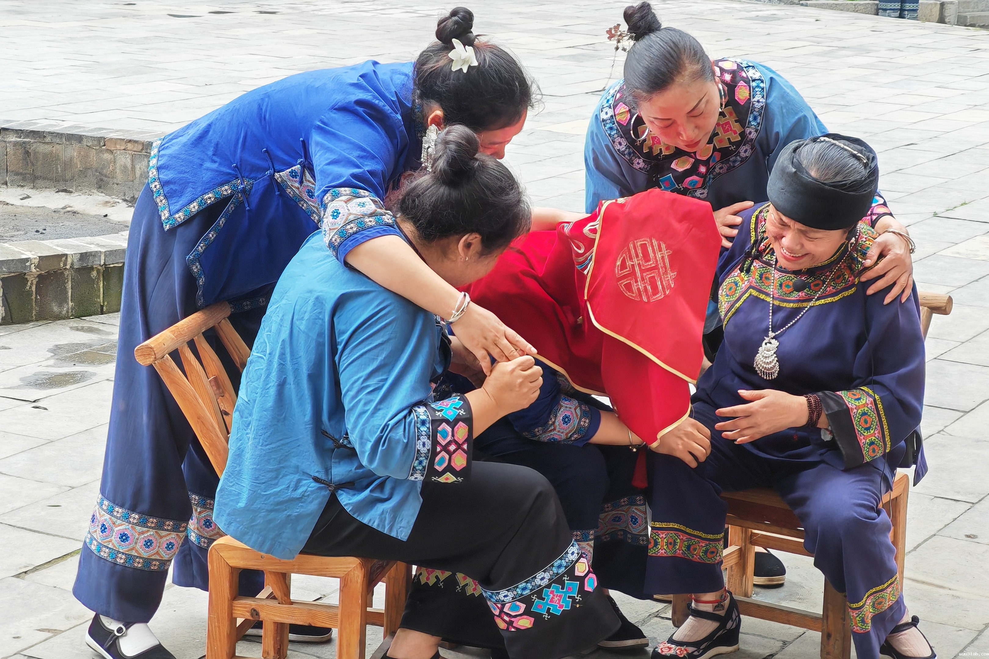 哭嫁歌同样是土家族的非遗项目之一,源自过去时代土家女出嫁时家人不舍的送别对话。即使听不懂土家话,传承人严水花老师生动的演绎仍然将同学们代入了离别的悲伤氛围。哭嫁歌有非常丰富的唱词,不同身份的哭嫁人对出嫁女子的嘱托和关切也各不相同。各人各调,形成了多声部的旋律。其歌词既包含历史传承下来的,也包含现场即兴的。传统哭嫁歌注重押韵,是宣泄真实情感的抒情性歌谣。以前土家女自小接触承载着土家族婚恋观念的哭嫁歌,用歌来把自己塑造成为温顺的妻子。当代社会女子婚姻观念的转变导致目前哭嫁歌面临着传承困境。