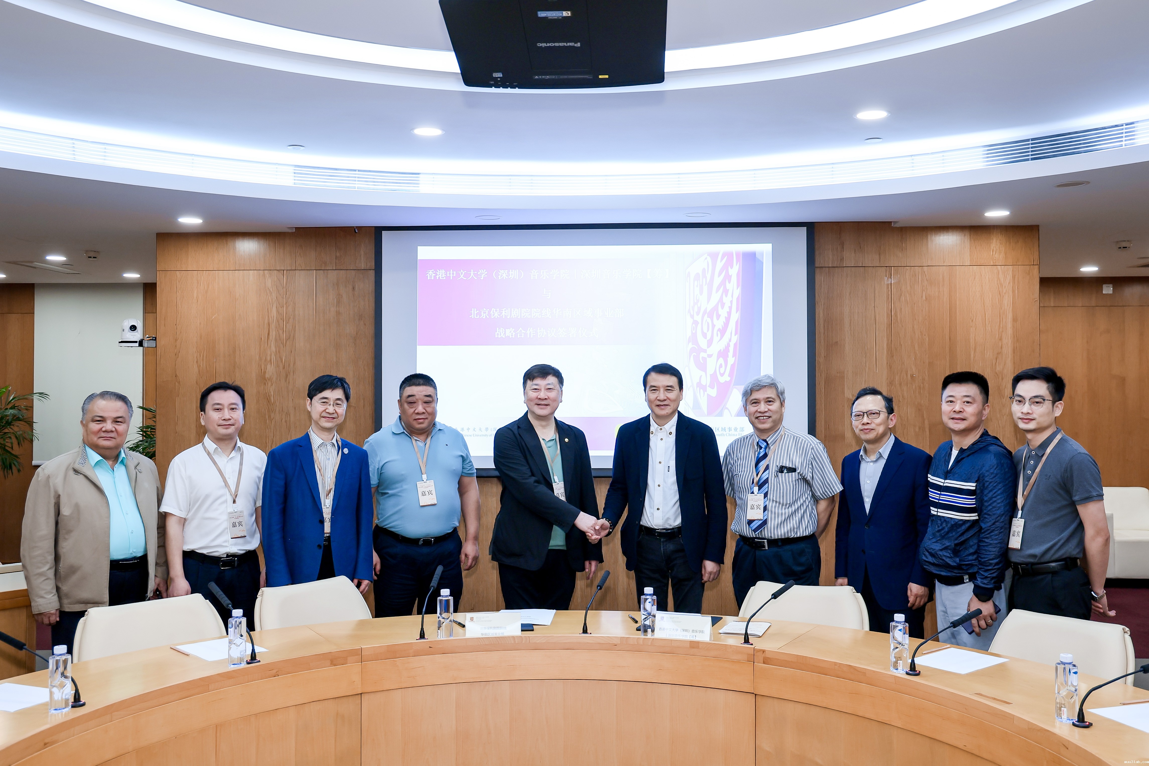 签署仪式合影(从左到右依次为:新疆艺术学院副院长阿不都赛米·阿不热合曼,深圳保利剧院总经理付俊林,中国音乐家协会副主席杨燕迪,保利剧院院线华南区域事业部总经理郭保京,保利文化党委副书记郭文鹏,betway在线登录院长叶小钢,betway在线登录助理院长张伯瑜,浙江必威首页登录平台院长王瑞,坪山大剧院总经理张军,东莞玉兰大剧院总经理余翔)