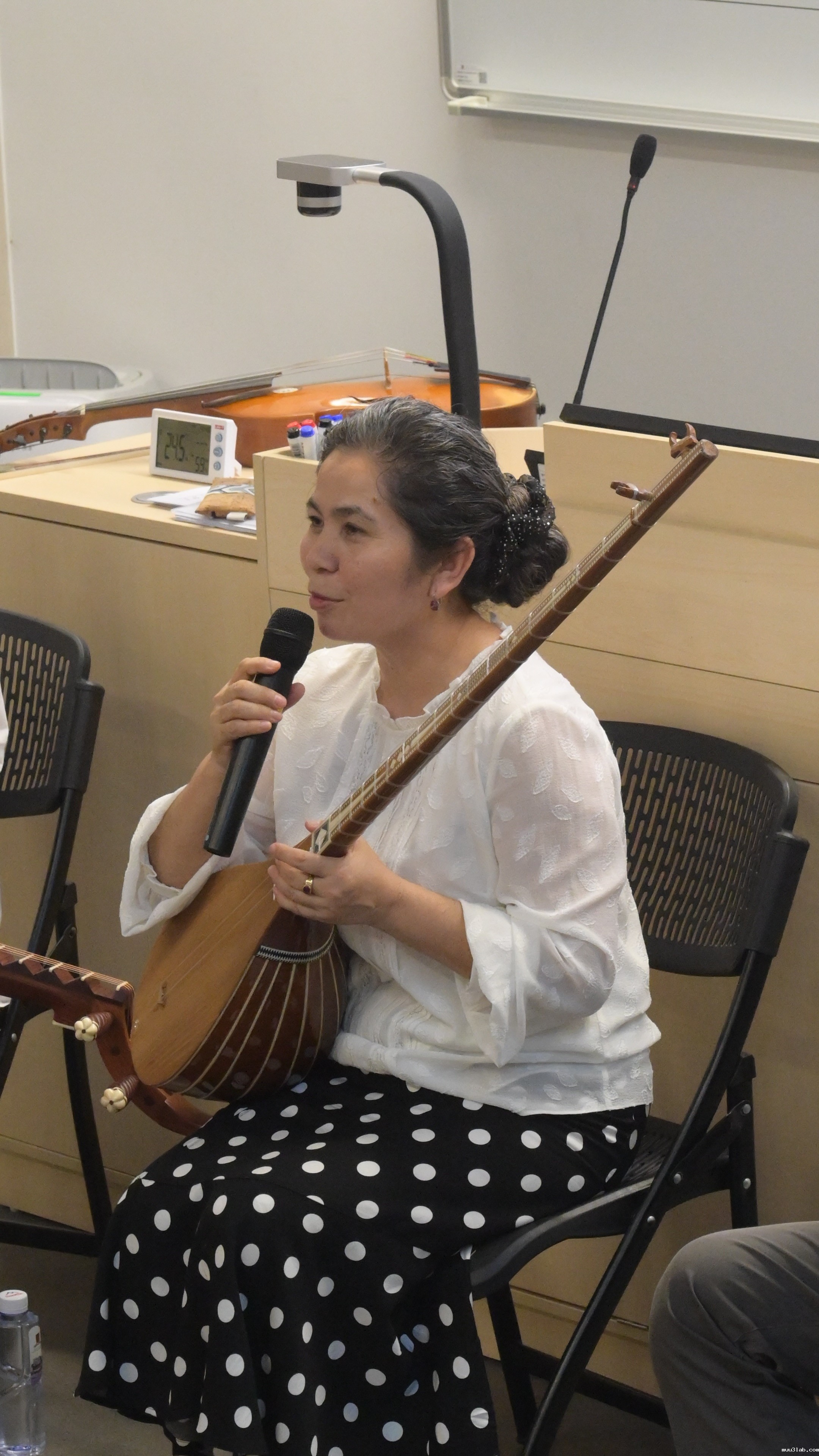 来自塔吉特坦斯的演奏家斯洛吉丁·朱拉耶夫(Sirojiddin Juraev)从乐器定弦的角度对比和讲述了他所演奏的都塔尔琴、坦布尔琴、萨托琴(Dutar/Tanbur/Sato)这三种乐器之间的区别。同时,维吾尔族演奏家赛努拜尔·吐尔逊(Sanubar Tursun)也向大家对比了新疆都塔尔琴在定弦上的不同,并从自己家乡的文化语境中为我们讲述了她眼中的都塔尔琴。