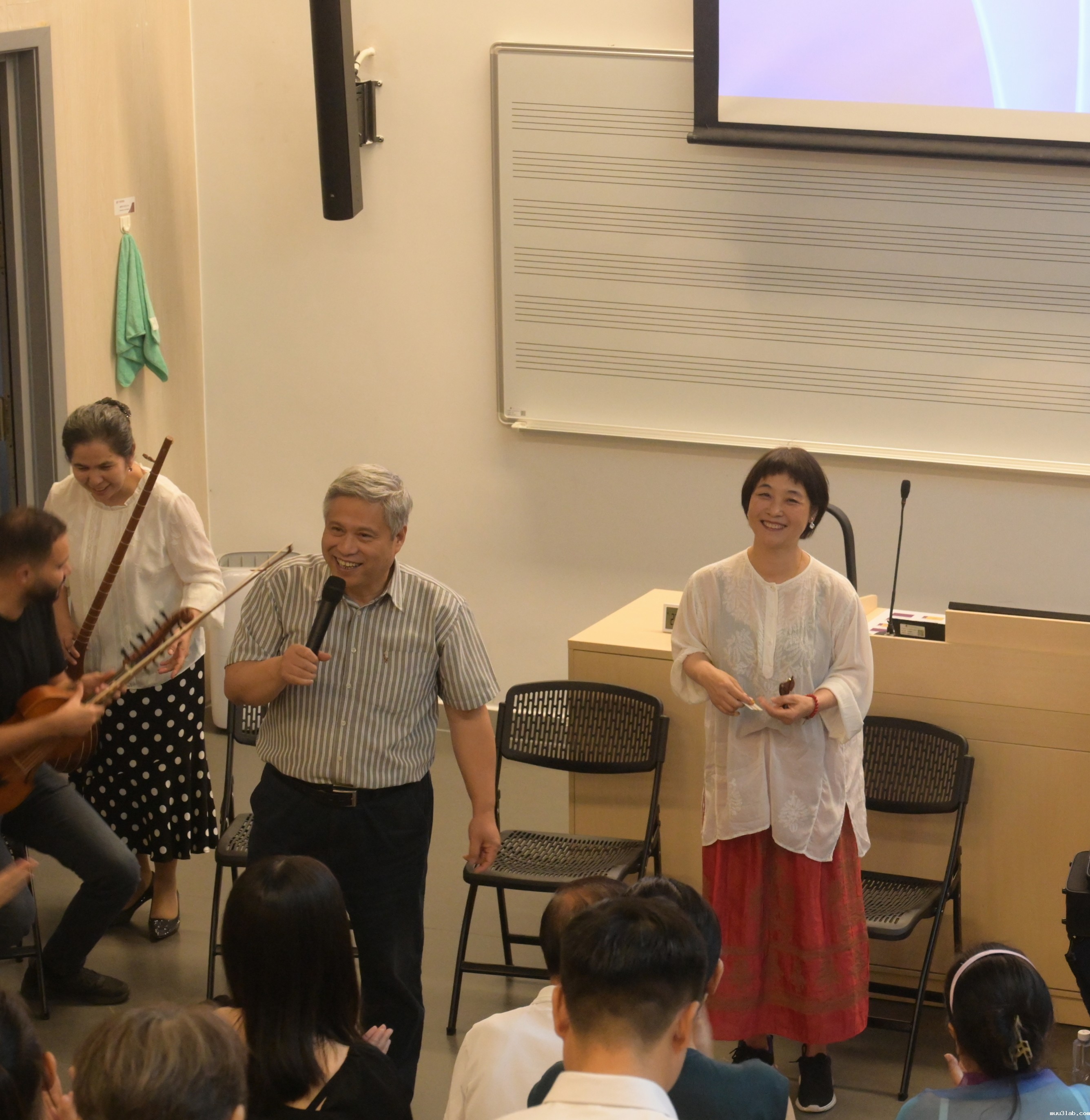 最后,艺术家们以一曲悠扬舒缓的《麦西来甫》结束了今天的工作坊活动。艺术家们动情演奏,赛努拜尔·吐尔逊老师引吭高歌,还有观众拿出自己的乐器一同演绎这场欢快的传统新疆歌曲。台下观众早已陶醉其中,曼妙轻音,心情飞扬。
