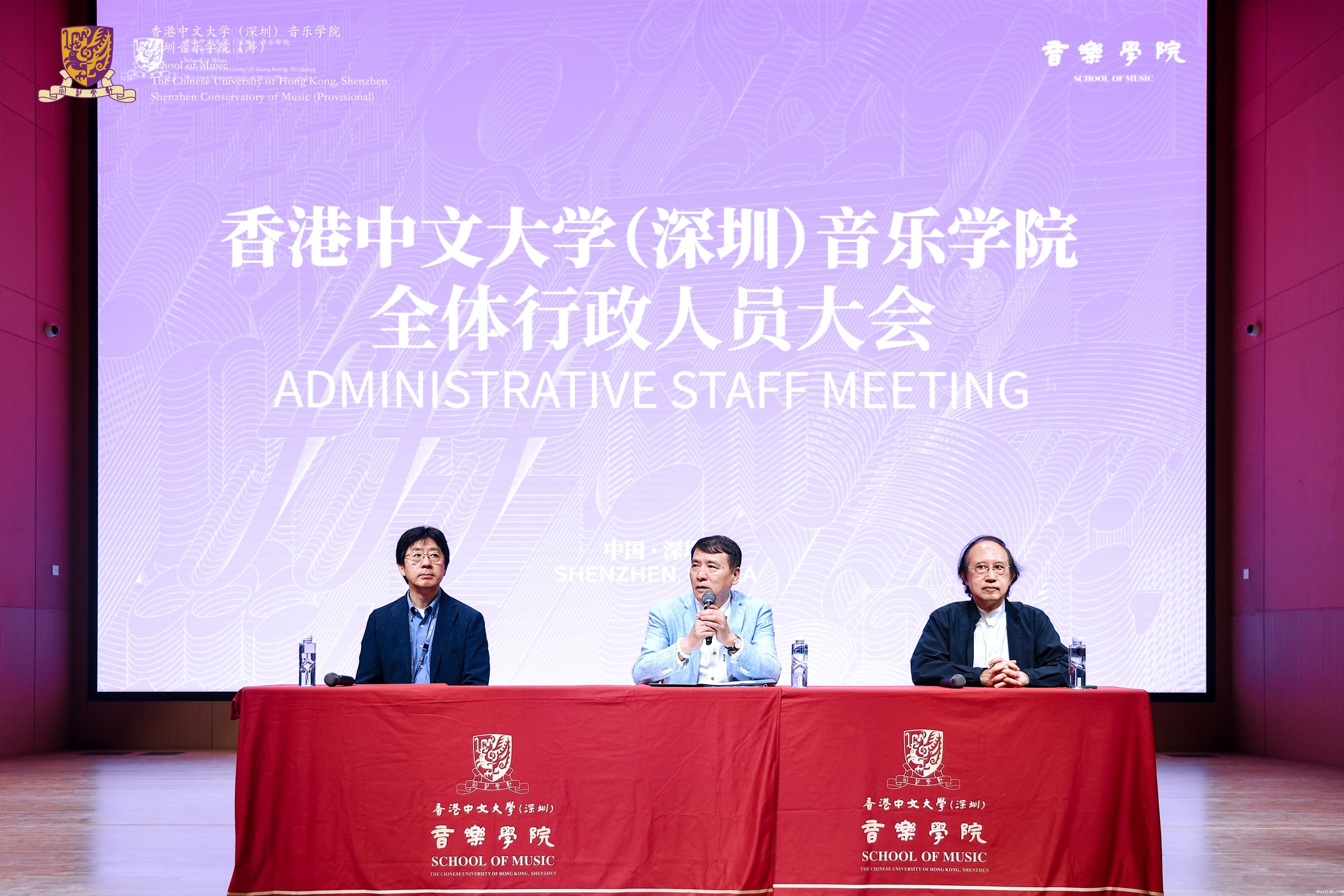 On 29 August, the Faculty & Administration Meeting was held on the new campus of the School of Music, The Chinese University of Hong Kong, Shenzhen. The meeting was chaired by Prof. Xiaogang YE, the founding dean of the School. Around 150 faculty and administrative staff attended the meeting. At the meeting, Prof. YE reviewed the academic and administrative progress over the past year and urged the faculty members and administrative staff to brace themselves for challenges and difficulties.