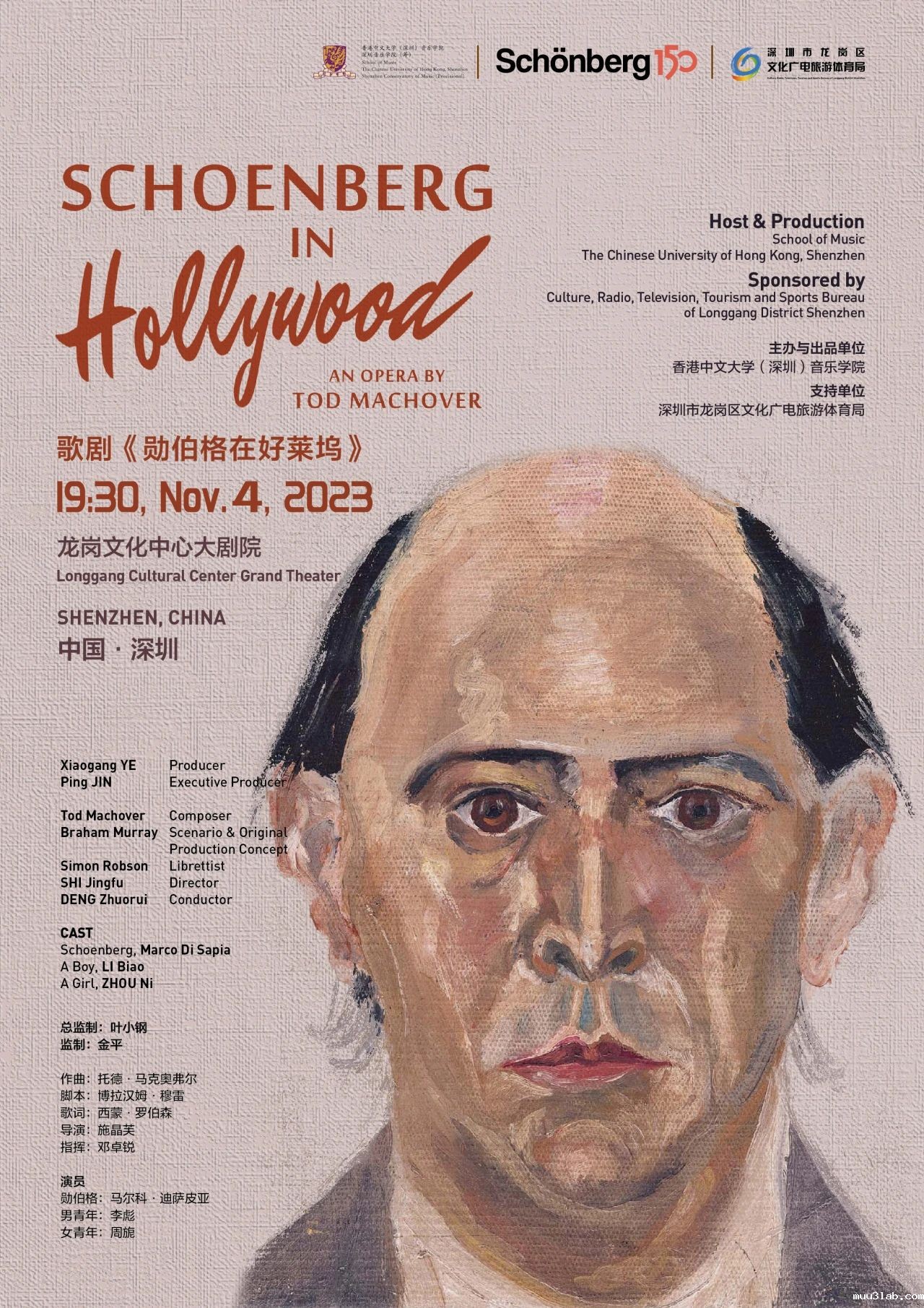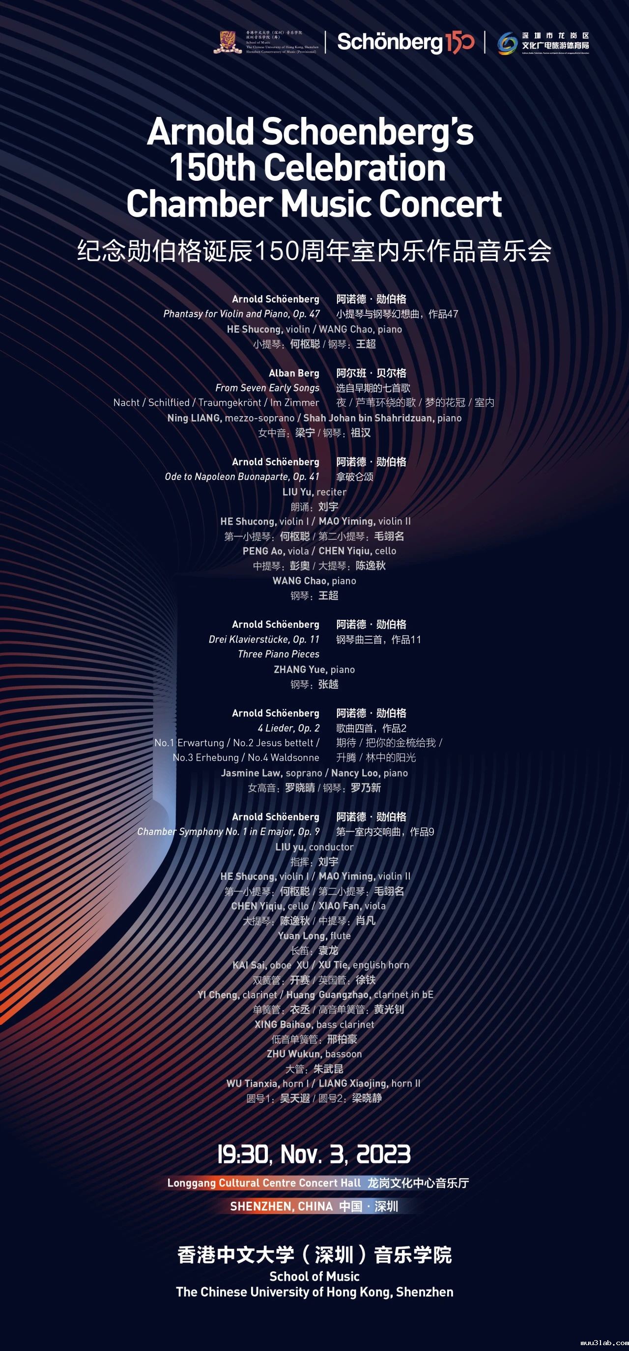 As an important part of the global commemorative events for Schoenberg, during the conference, there will be a concert featuring Schoenberg's chamber music works at the Concert Hall of Longgang Cultural Center on the evening of November 3. Additionally, on the evening of November 4, the opera Schoenberg in Hollywood, composed by American composer Tod Machover, will be performed at the Grand Theater of Longgang Cultural Center.